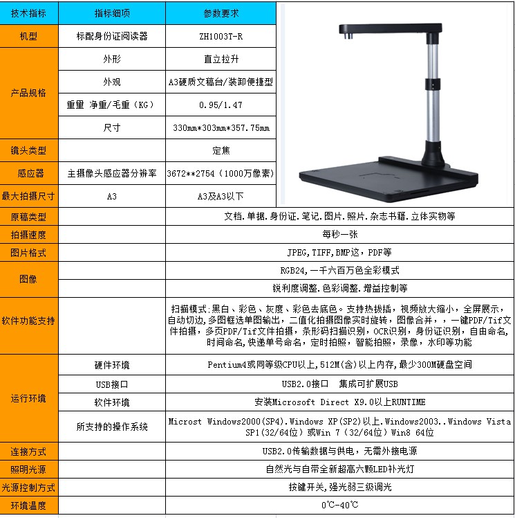 A3幅面 主攝像頭感應(yīng)器分辨率:3742*2806(1000萬像素)定焦 USB2.0 弱-強-關(guān)三級調(diào)光,圖片格式JPG/PDF/TIF, 標(biāo)配硬底坐,帶卡槽方便精準定位拍照。產(chǎn)品特點:穩(wěn)固結(jié)實大氣,可擴展兩個USB ,配身份證閱讀器,方便快捷提高辦公效率,拍攝類型:黑拍白/彩色/灰度/彩色去底色