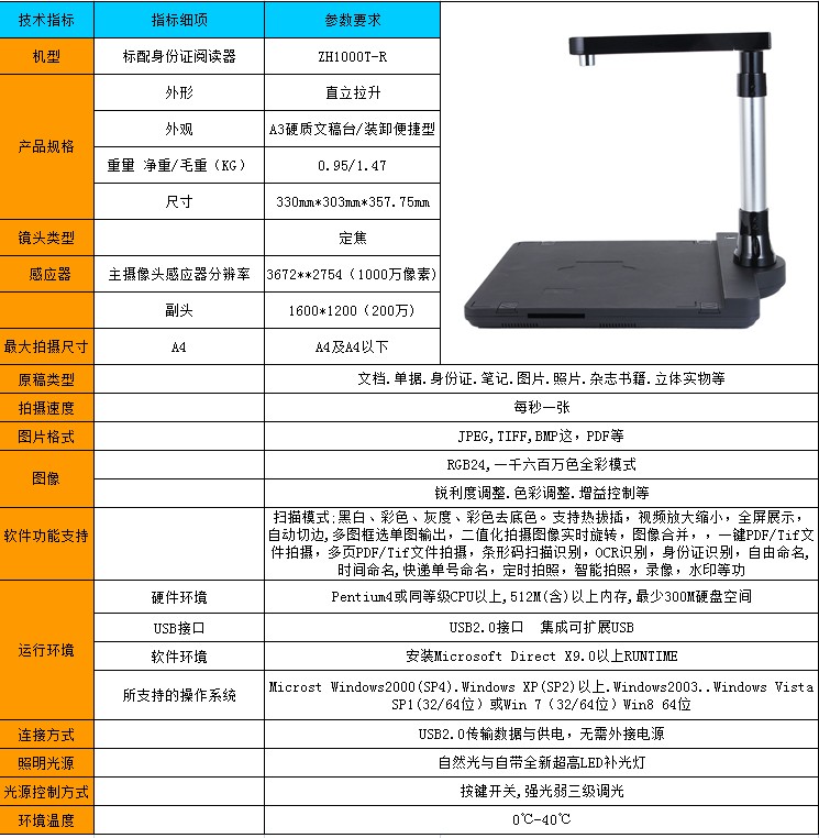 A4幅面 主攝像頭感應(yīng)器分辨率:3742*2806(1000萬像素)定焦 USB2.0 弱-強-關(guān)三級調(diào)光,圖片格式JPG/PDF/TIF, 標(biāo)配硬底坐,帶卡槽方便精準定位拍照。產(chǎn)品特點:穩(wěn)固結(jié)實大氣,可擴展兩個USB ,配身份證閱讀器,方便快捷提高辦公效率,拍攝類型:黑拍白/彩色/灰度/彩色去底色
