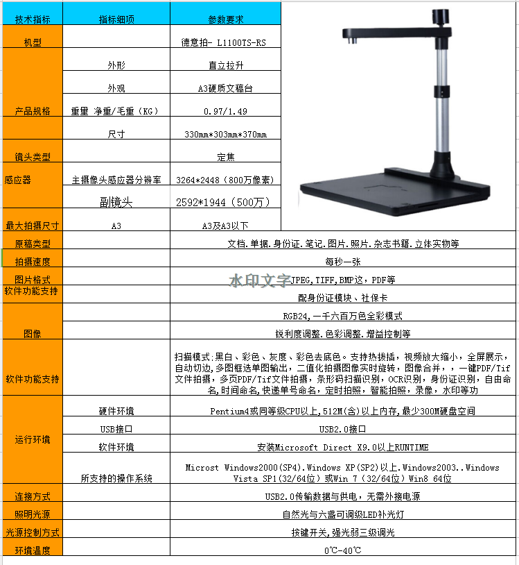 A3幅面 主攝像頭感應(yīng)器分辨率:3742*2806(1000萬像素)副頭:500萬 分辨率:2592*1944定焦 USB2.0 弱-強(qiáng)-關(guān)三級調(diào)光,圖片格式JPG/PDF/TIF, 標(biāo)配硬底坐,帶卡槽方便精準(zhǔn)定位拍照。產(chǎn)品特點(diǎn):穩(wěn)固結(jié)實(shí)大氣,可擴(kuò)展兩個USB ,配身份證閱讀器/社???/span>,方便快捷提高辦公效率,拍攝類型:黑拍白/彩色/灰度/彩色去底色