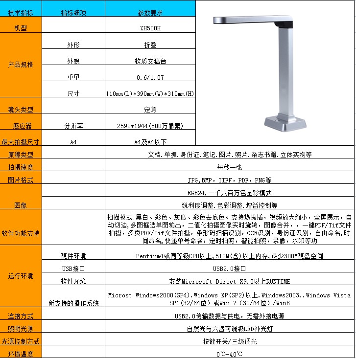 折疊外觀, A4幅面、主頭500萬像素,雙USB2.0接口